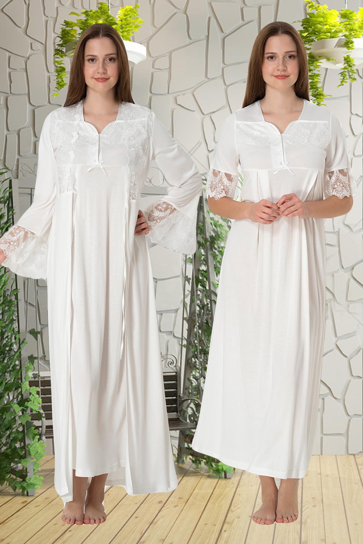 Effortt 9015 Ekru Dantelli Sabahlıklı Lohusa Gecelik Takımı