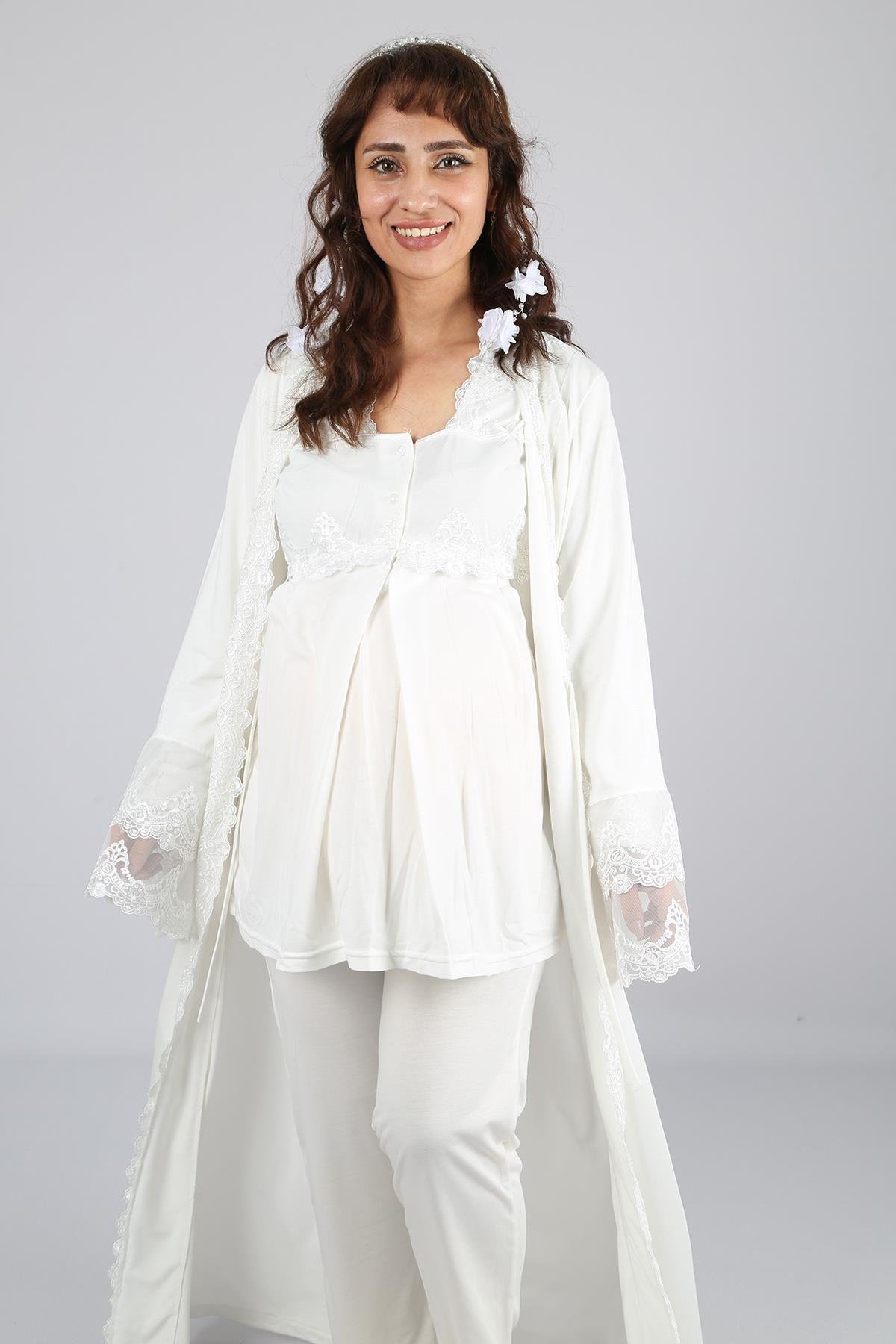 Ekru Prenses Dantelli Sabahlıklı Uzun Kol Lohusa Pijama Takımı 70140 (70140)