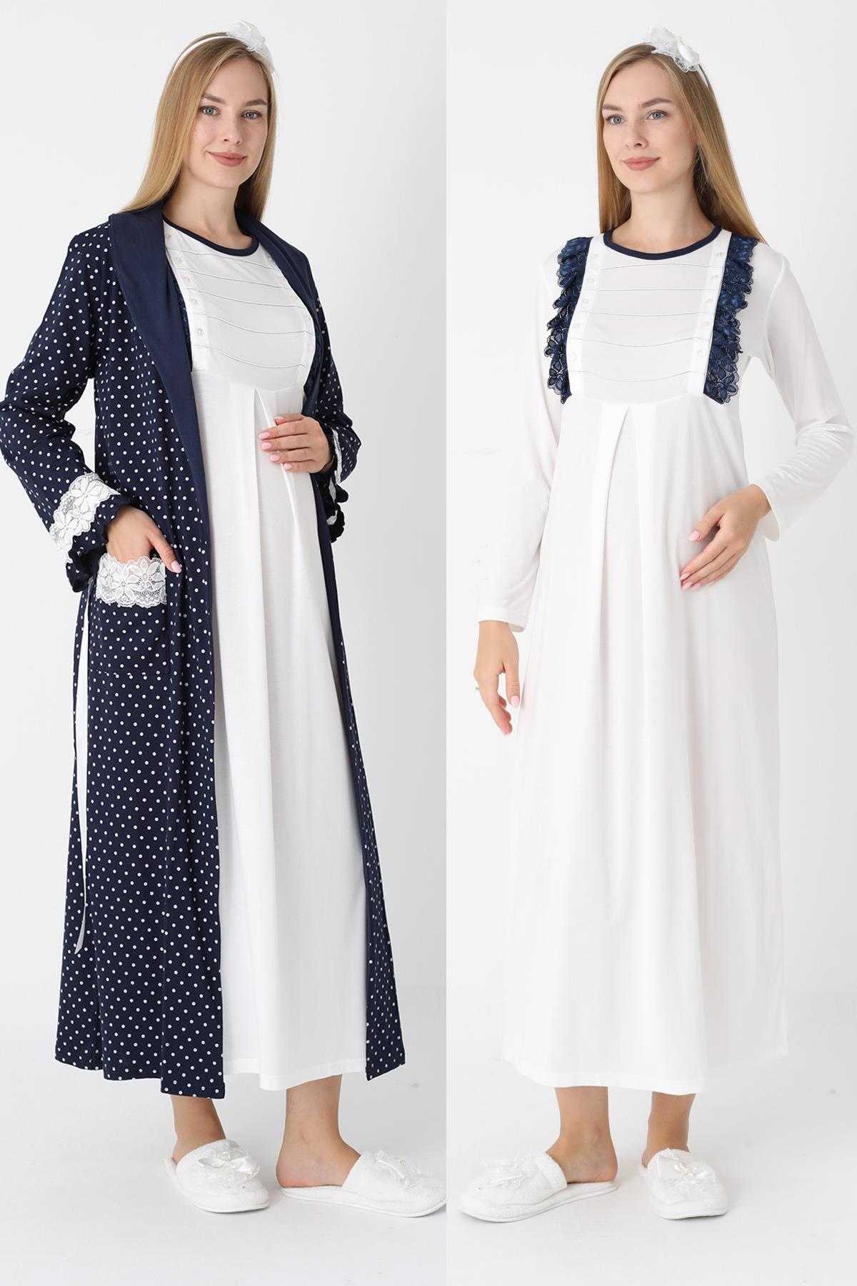 Erdeniz 2308 Lacivert Çift Taraflı Düğmeli Emzirme Özellikli Sabahlıklı Lohusa Gecelik Takımı (2308)