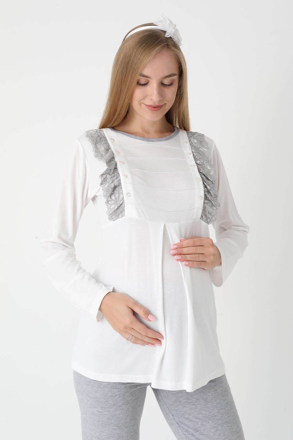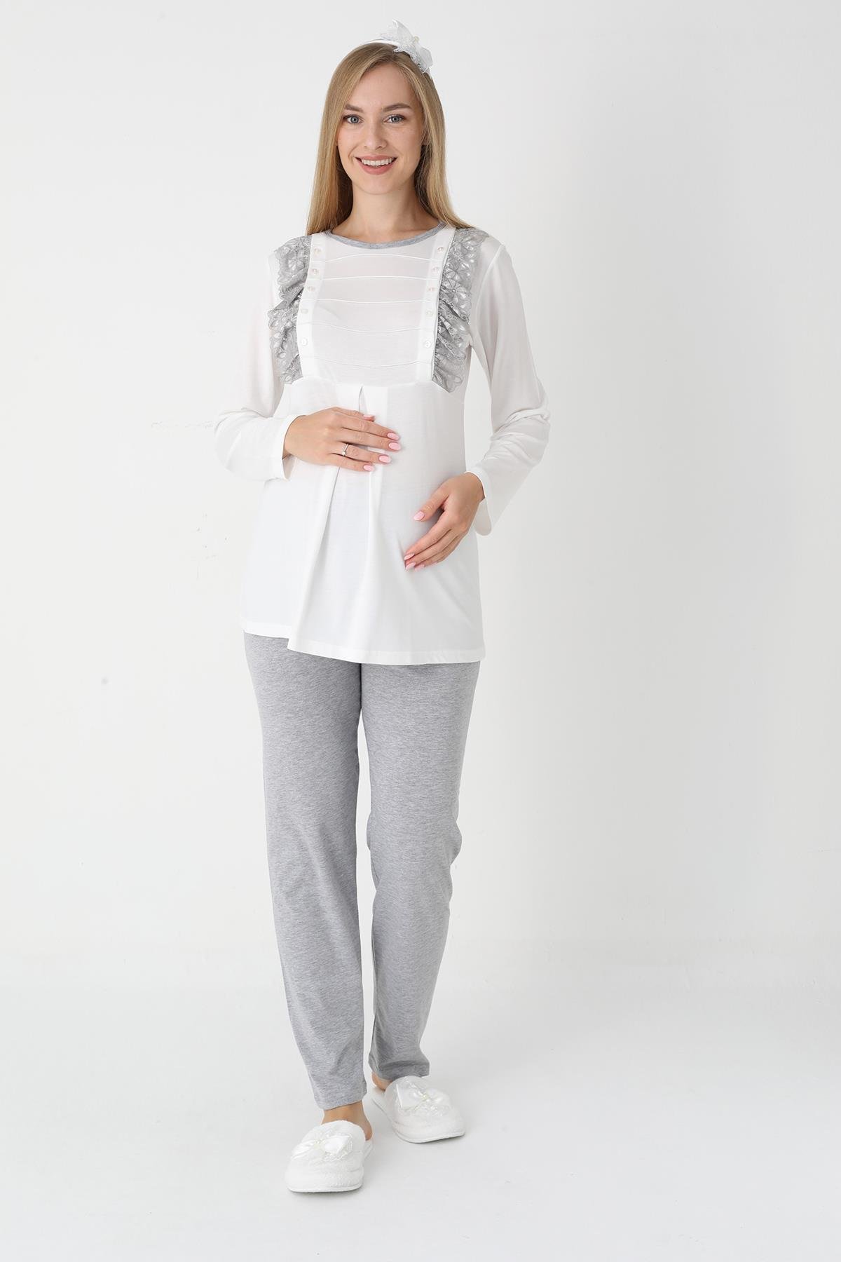 Erdeniz 3451 Gri Puanlı Düğmeli Emzirme Özellikli Sabahlıklı Lohusa Pijama Takımı (3451)