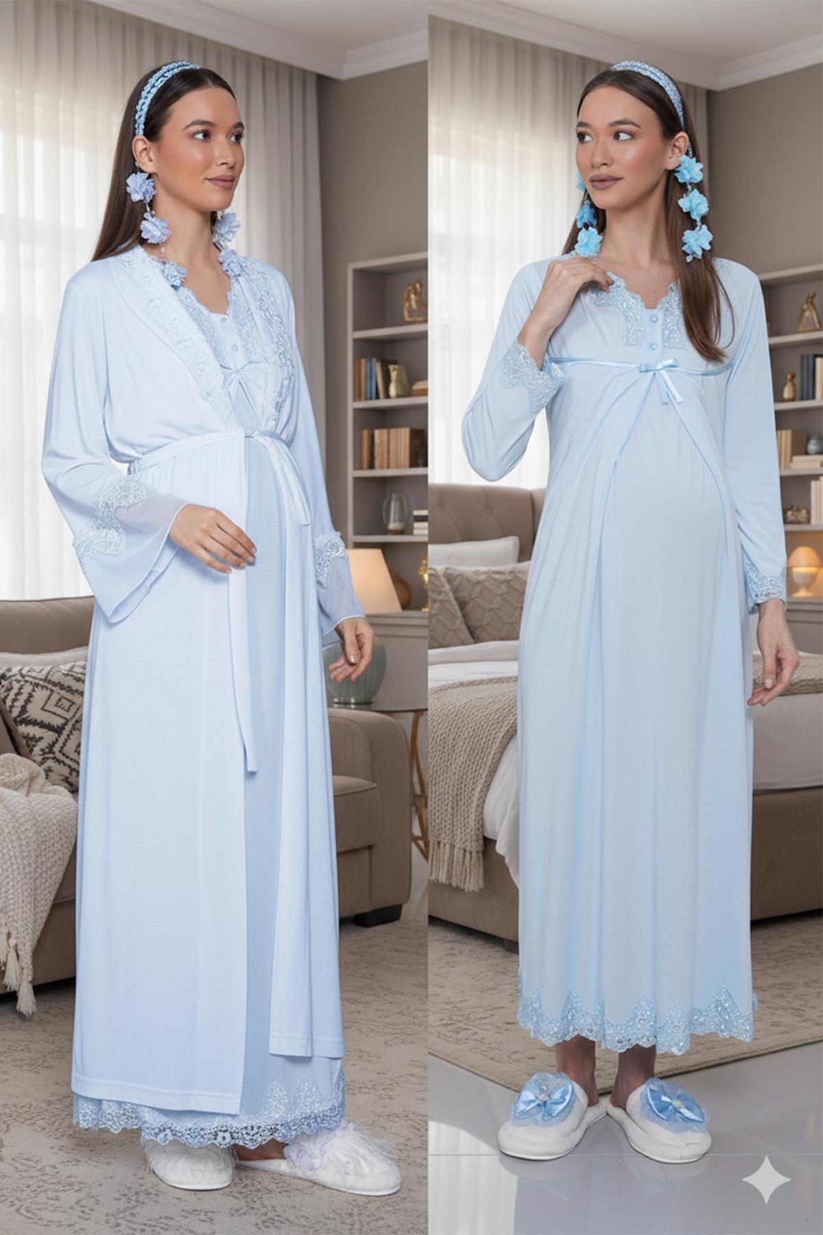Gizli Emzirme Özellikli Mavi Sabahlıklı Lohusa Gecelik Takımı 17035 (17035)