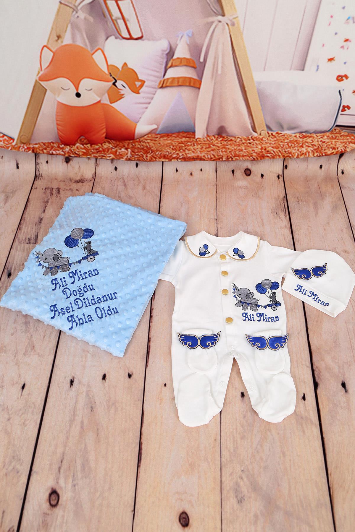 İsme Özel Fil Balon Figür Nakışlı 4lü Hastane Çıkış Set (Lh11214)