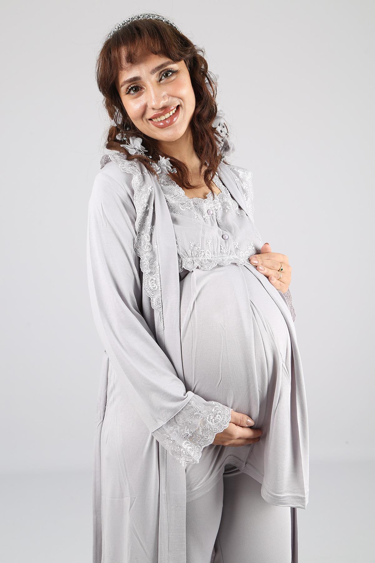 Gri Dantel Sabahlıklı Uzun Kol Hamile Lohusa Pijama Takımı 2601
