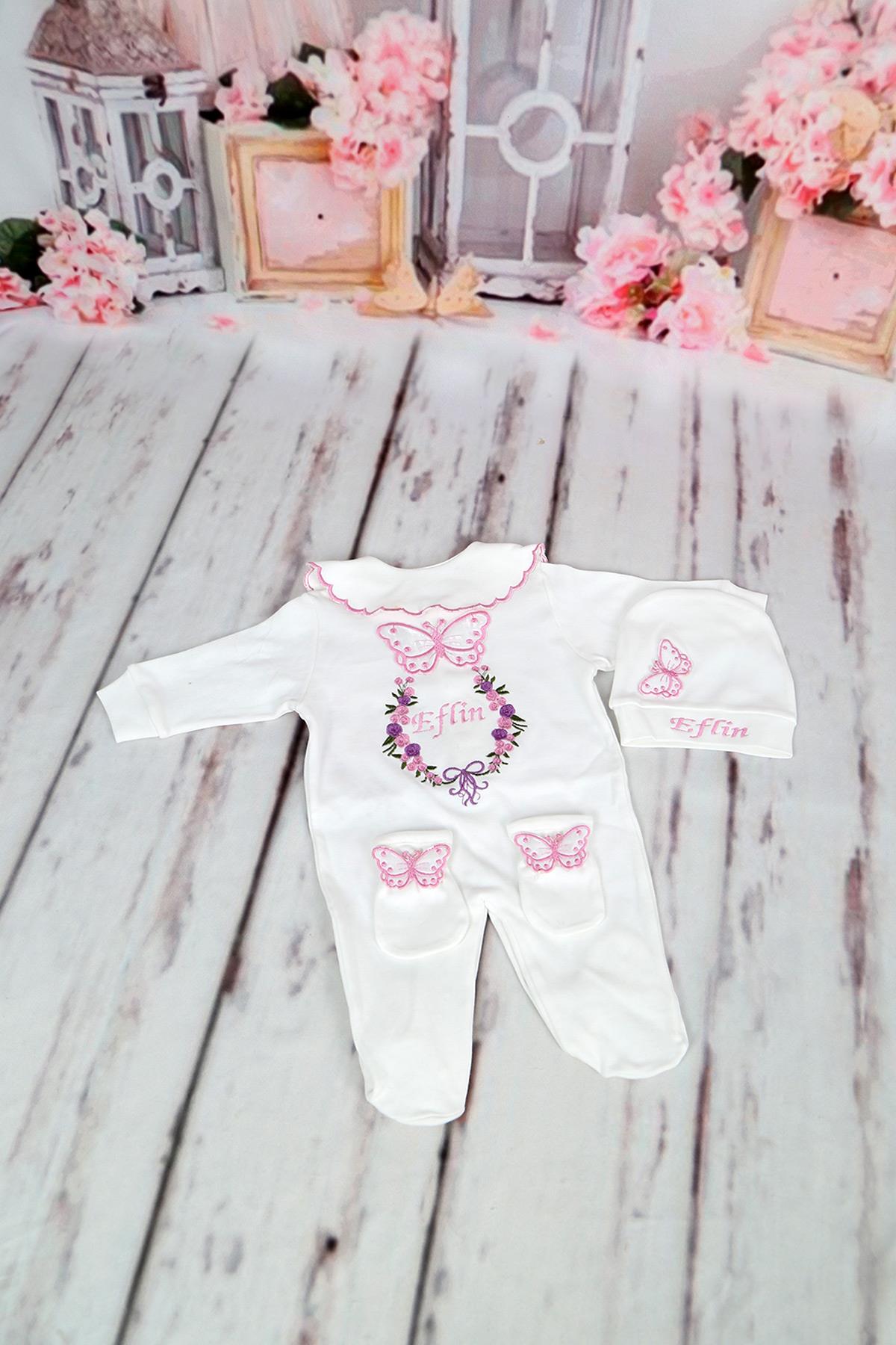 İsme Özel Pembe Kelebek Nakışlı 3lü Hastane Çıkış Set