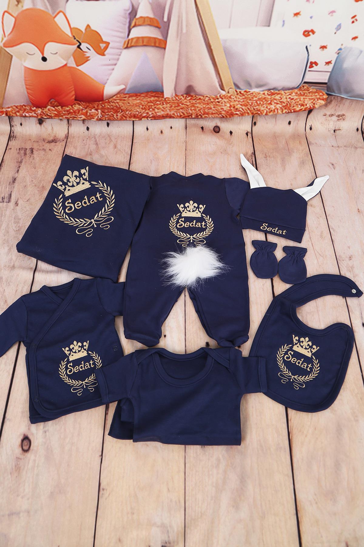 İsme Özel Tavşanlı Lacivert Gold Tac Nakışlı Hastane Çıkışı 10lu Set (Lh1075)