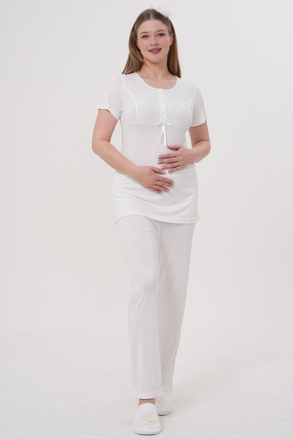 Mecit 1541 Ekru Uzun Sabahlıklı Lohusa Pijama Takımı